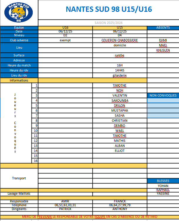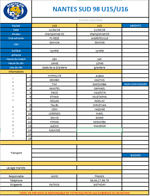 Informations U15 U16